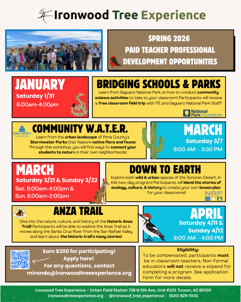This 1-day professional development workshop will be led by Saguaro National Park and Ironwood Tree Experience staff at the Saguaro NP West (Tucson Mountain District). The workshop introduces high school teachers to guided community science activities, for use with classes that can be applied inside the Park, public lands, schoolyards, and community spaces. Additionally, participating teachers will receive a free class field trip, transportation funds, access to curriculum, and NPS staff support during field trips.