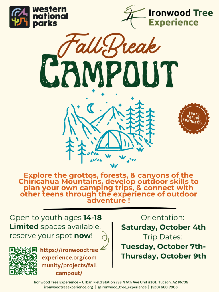 Join us for an engaging adventure in the Chiricahua Mountains during your fall break on October 7-9. By signing up for this campout you will: